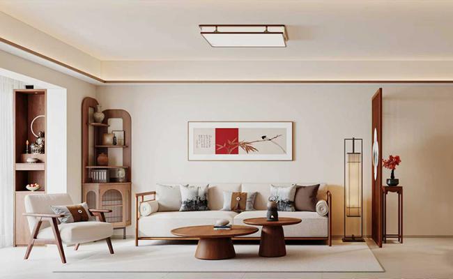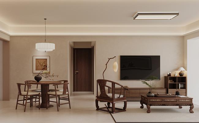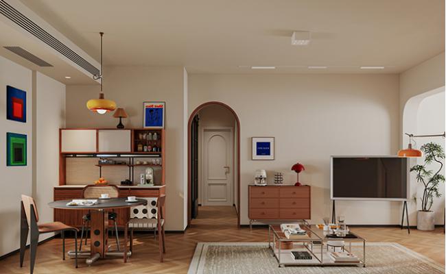 以暖白色啞光柜體、胡桃木色臺面/家具、人字拼木地板為主,搭配大理石紋理裝飾件,呈現(xiàn)自然溫潤的質(zhì)感;線性燈光(營造柔和氛圍)、懸浮式柜體(弱化厚重感)、透明餐椅(減輕視覺負擔)等元素,強化了“輕簡”的現(xiàn)代感;既滿足現(xiàn)代家庭的“互動式生活”需求(客餐廚聯(lián)動),又通過家政區(qū)的獨立設置提升實用性,是“美學與功能平衡”的當代居住空間設計案例。
