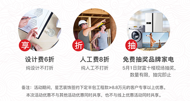 在這裝修的最好時節,星藝裝飾開啟裝修狂歡季,帶來了多重優惠豪禮。設計費6折,人工8折,活動現場可參與砸金蛋抽取品牌家電,100%中獎,。從設計到施工,您要的優惠,盡數奉上。