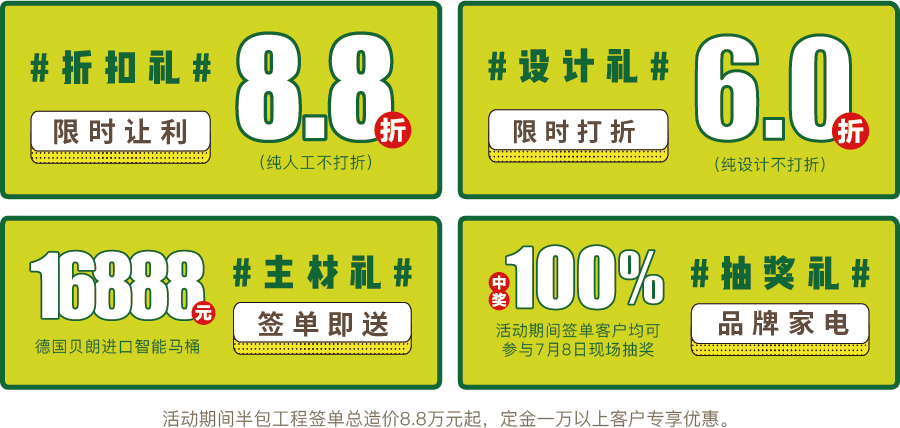 活動期間(6月17日-7月8日),簽單下定業主可享受設計費6折,人工8.8折簽單優惠,還可獲贈價值16888元德國進口貝朗智能馬桶一個,7月8日可到財富廣場東塔參與品牌家電抽獎,百分百有獎,數量有限,抽完即止。