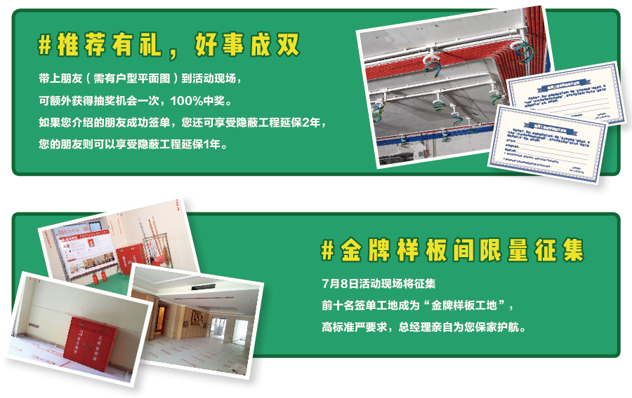 與好伙伴同享好禮,就是節日的意義。那么,這次驚喜大禮怎能不告訴你身邊的小伙伴呢。推薦好友成功簽單,豪禮翻倍。7月8日活動現場推薦好友成功簽單,您 即可享受隱蔽工程延保2年,您的朋友 也能享受隱蔽工程延保1年。好品質,值得分享。