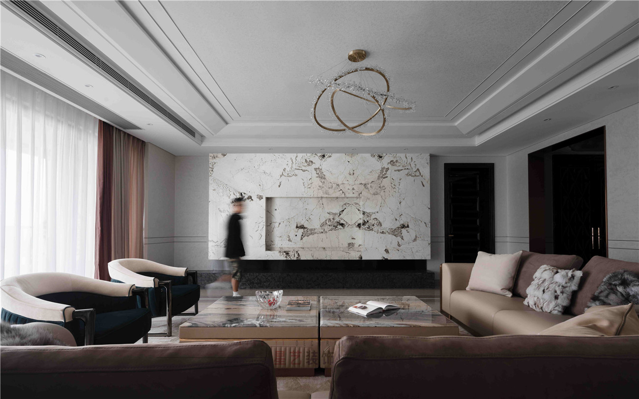 本案設計是位于海珠區380㎡的住宅,擁有無敵景觀一視野,業主90后,準備做婚房,要求輕奢,鐘愛石材,金屬和皮質的家居風格,敞開式書房通過隔斷可移動屏風于客戶區域串聯起來,可開可隔斷的靈動組合,最大的強化空間包容及開闊性,用中西結合的方式為即將到來的婚姻生活帶來更高的幸福指數,打造溫馨的生活環境。