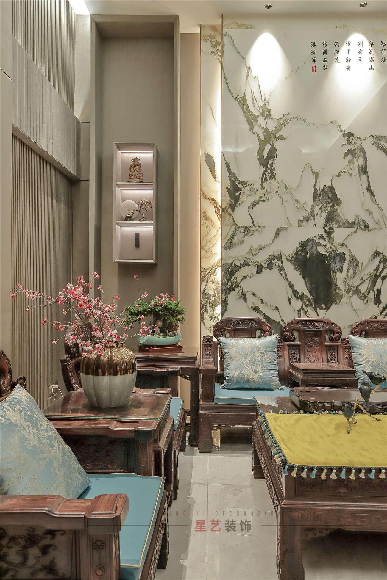 客廳采用古色古香的紅木家具,雕刻不繁復,顏色不沉悶,整體端莊大氣,沉穩時尚。尤其是水墨紋路的大理石墻面,提煉出古典元素的精髓,綠盆景更是讓整個設計提升了清幽雅致的風水畫格調。