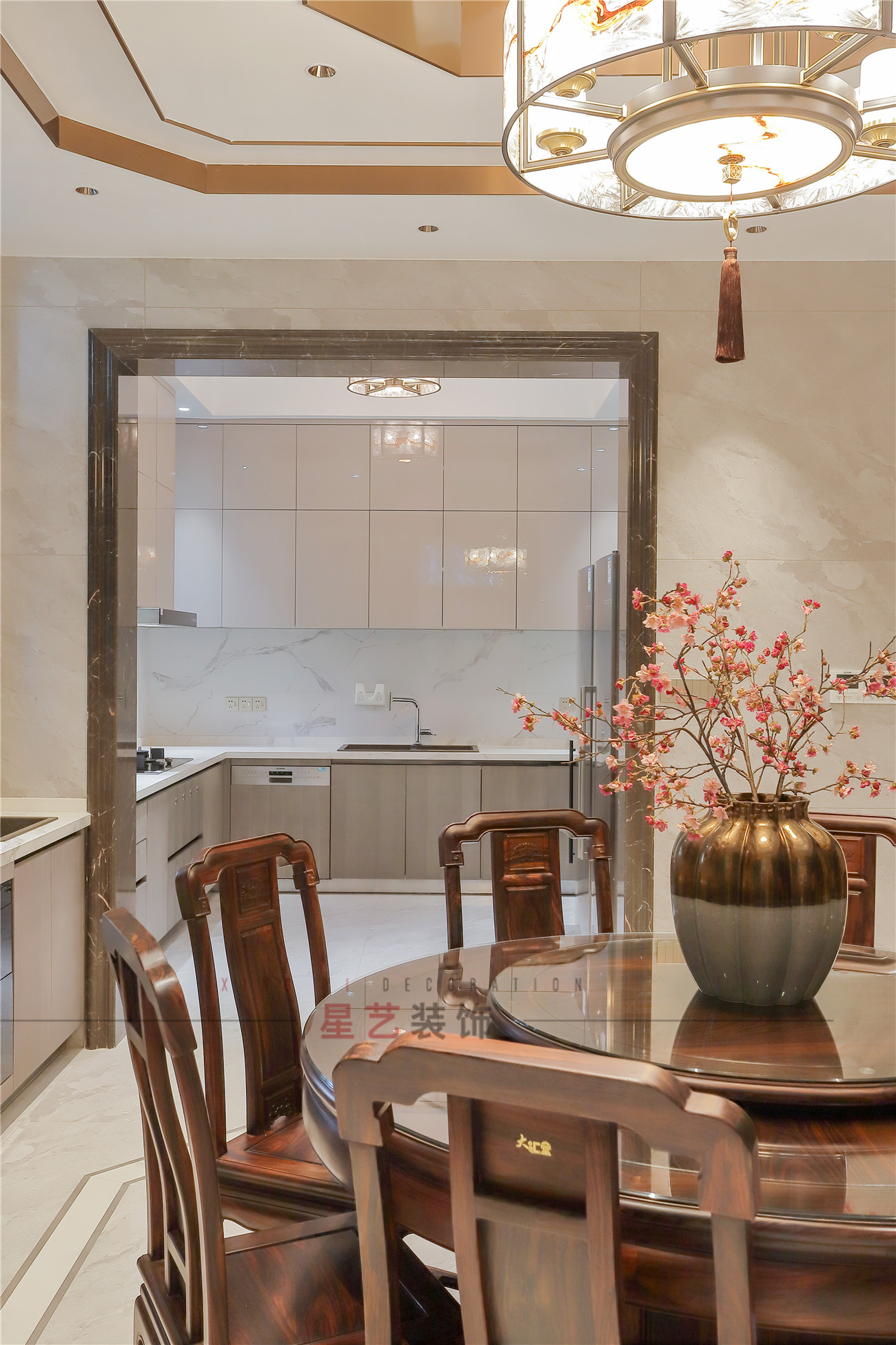 用餐區和廚房相通,墻面,地面和臺面都以大理石為主,吊頂用金色線條勾勒,搭配仿古吊燈,彰顯輕奢元素的同時也有古典韻味,沒有過多的堆砌裝飾,家的作用也回歸到了居住本身。