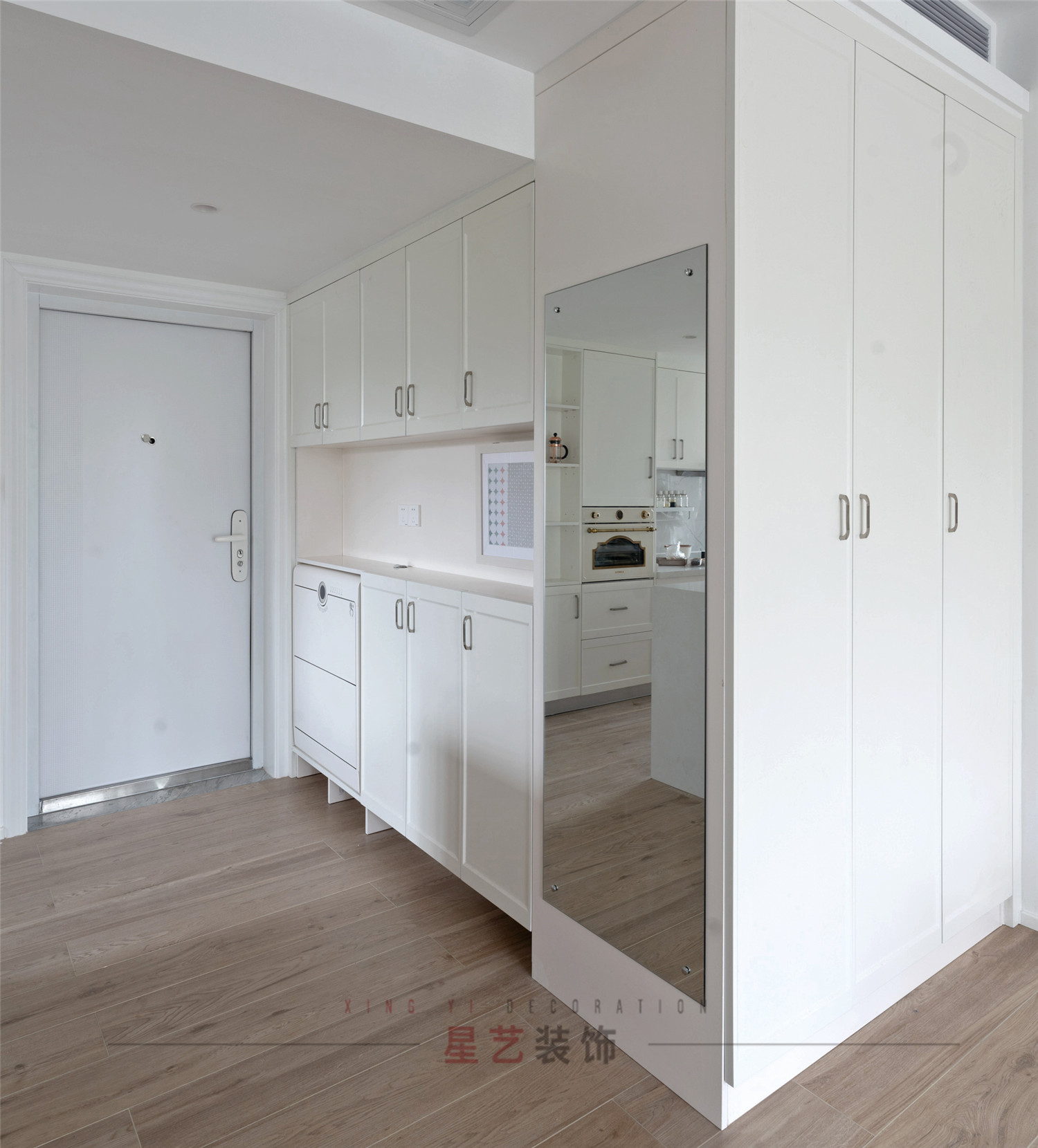 玄關雖然占地面積小,卻是每天的必經之地,超大的容量的儲物柜具有強大的功能性與實用性,底部留空的設計方便打掃又能放日常更換的鞋子,干凈整潔。