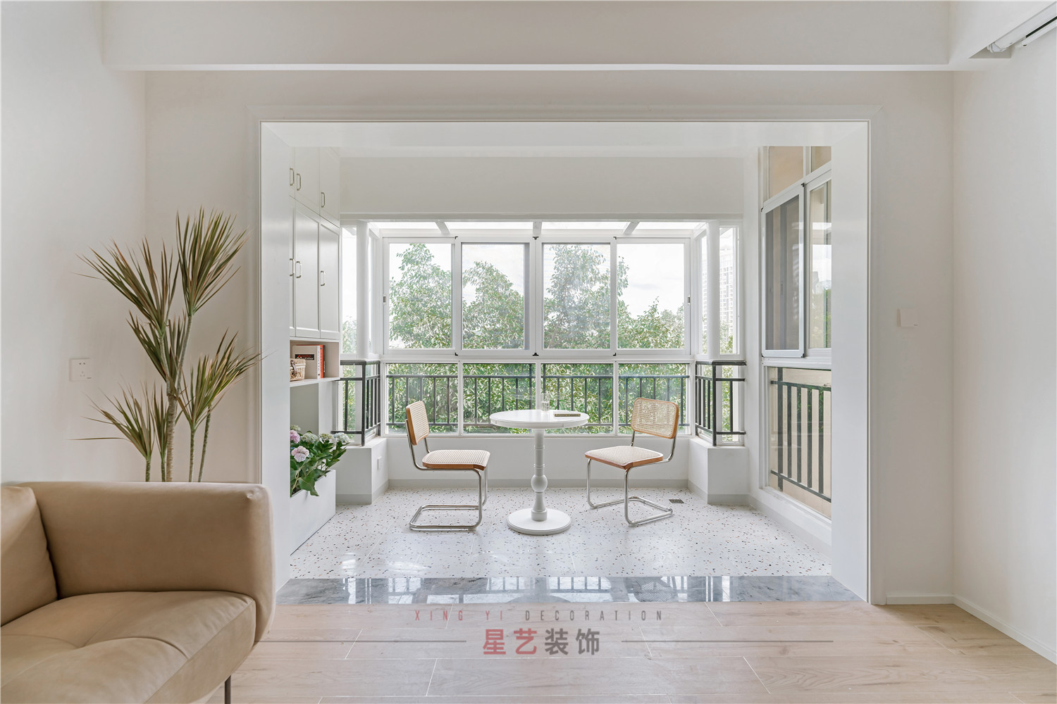 陽臺連接客廳拓展空間,原木色與綠植的結合打造出自然系的家居生活,感受獨處的愜意。