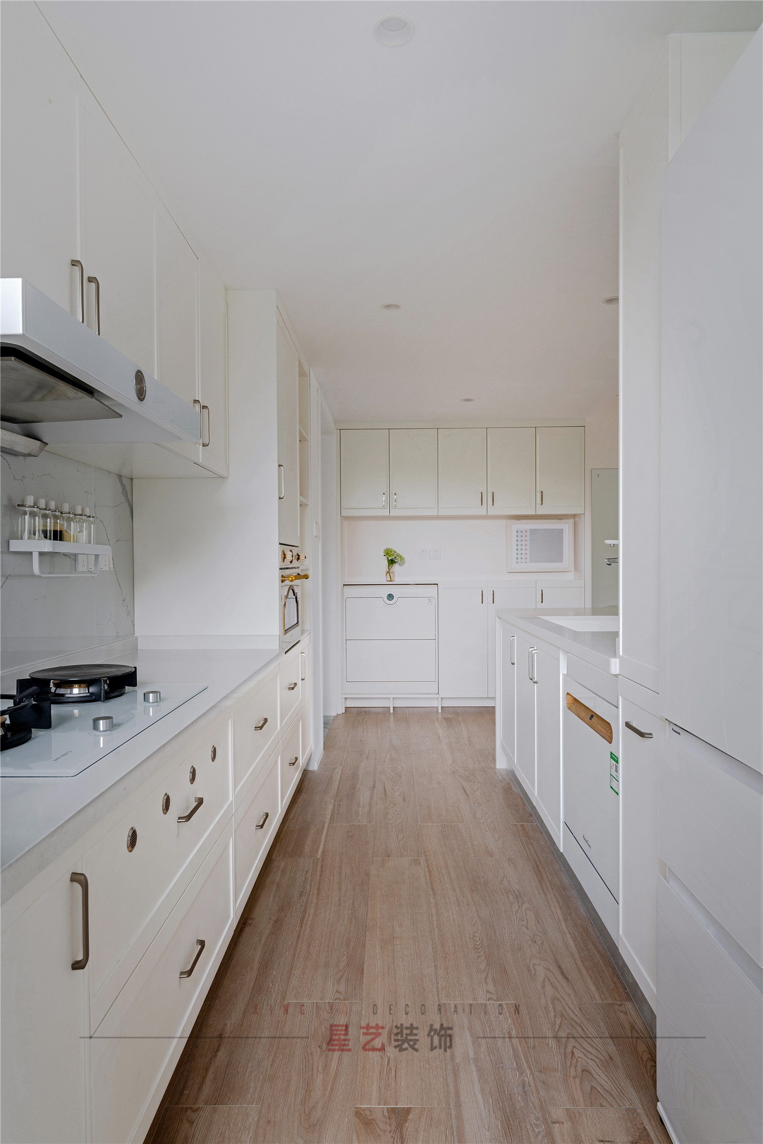照明是摒棄傳統一個主燈點亮整個房子的方式,采用射燈,軌道燈,燈帶局部照明,讓整個房子更有層次,不管是軌道燈打到墻上反射出來的還是燈帶從天花折射出來的燈光都是非常柔和的,即使是射燈也是采用4000K(中性光)防炫射燈,讓整個空間更加柔和舒適。墻面及所有房門跟柜體也是統一白色讓整個房子更整體,踢腳線也是采用宅邊白色貫穿整個房子。