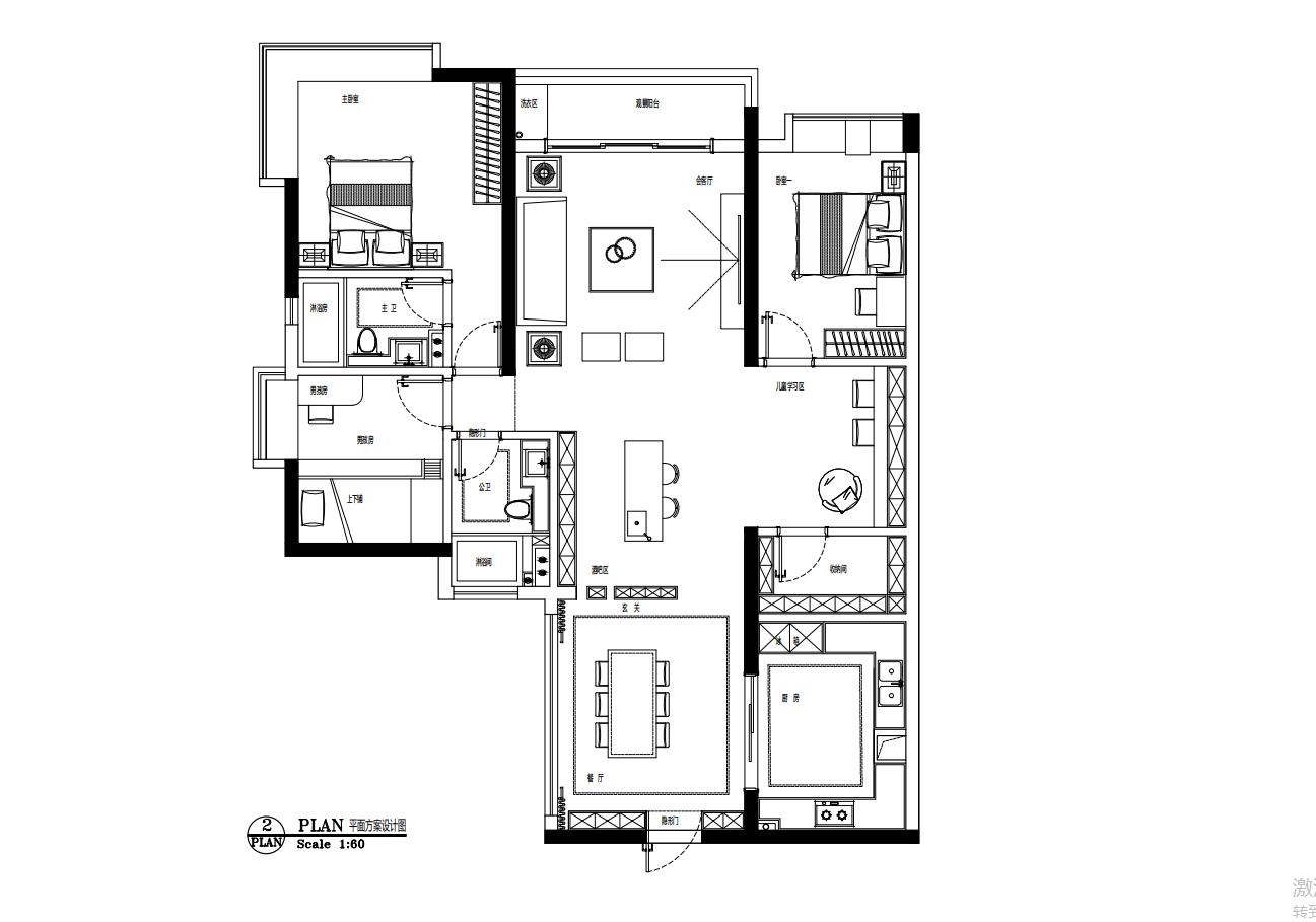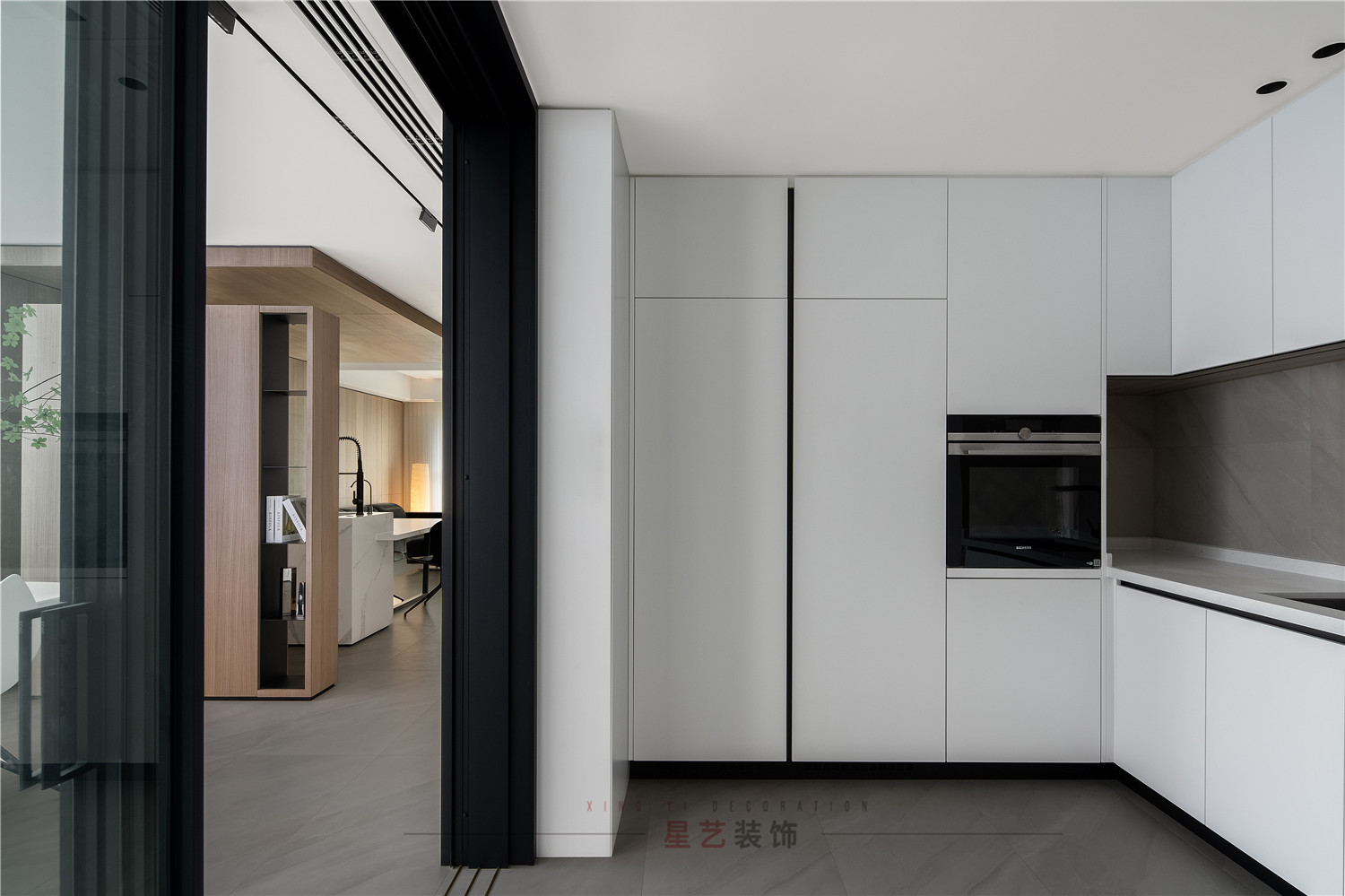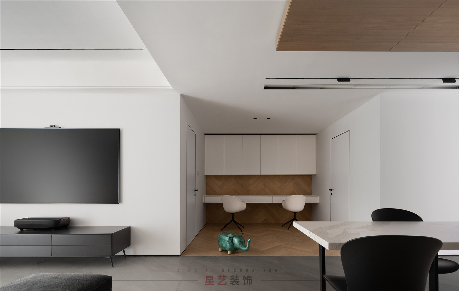 值得一提的是,整個設(shè)計都采用了大量的隱形門設(shè)計,利用空間的錯落造成視覺上落差,既不會顯得突兀也豐富了整體的空間層次。