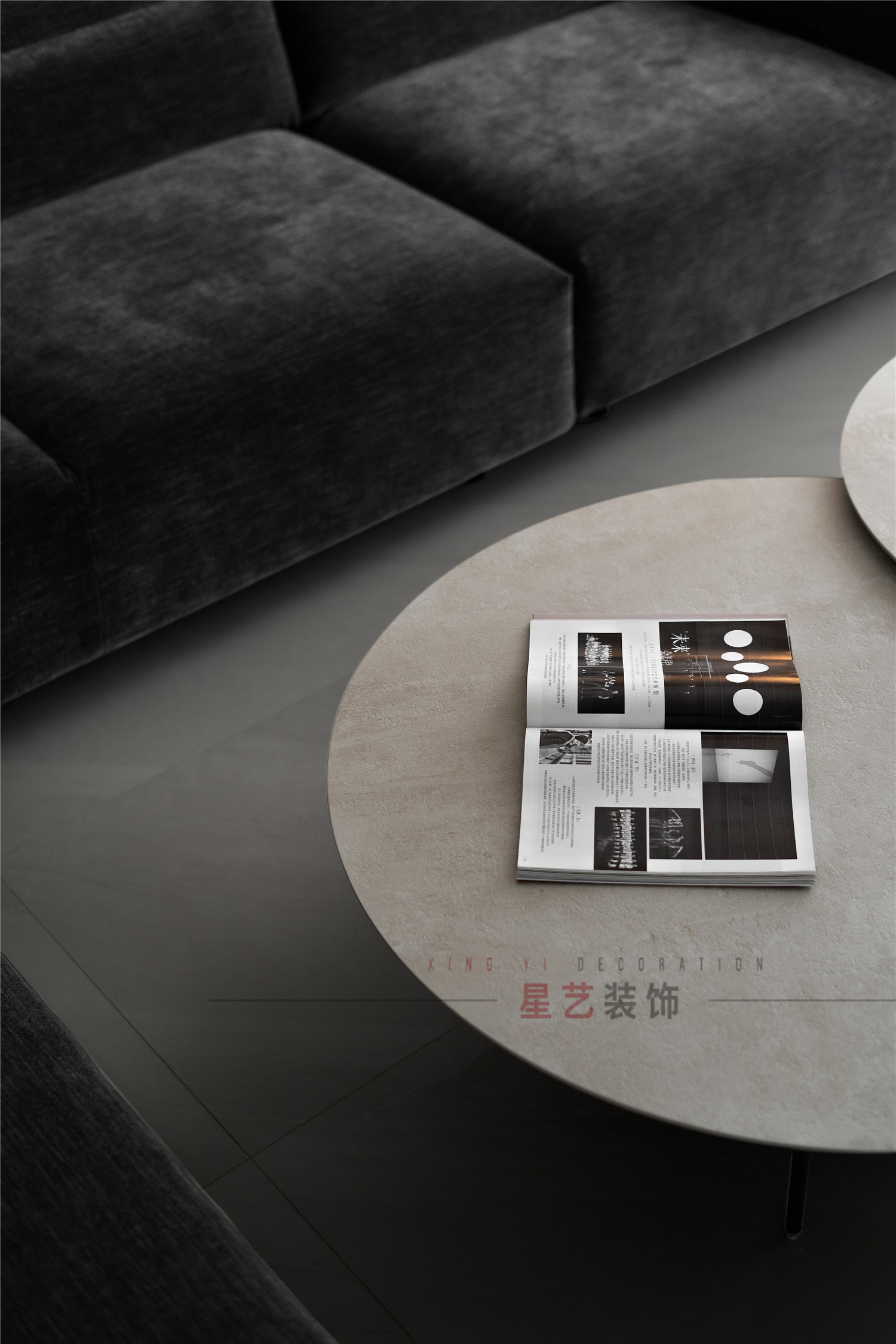 客廳是經(jīng)典的黑白灰設(shè)計,極簡風(fēng)格盡顯高級大氣,柔軟舒適的絨面深色沙發(fā)搭配拼接圓桌,簡約精致又賦予時尚魅力,整體上僅用色彩的沖擊與家具的質(zhì)感展現(xiàn)設(shè)計的精妙。