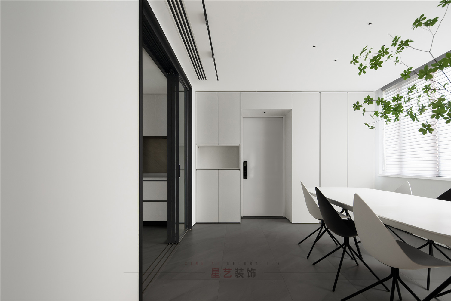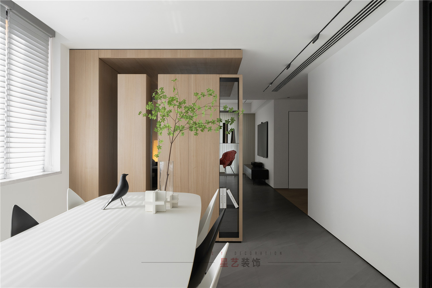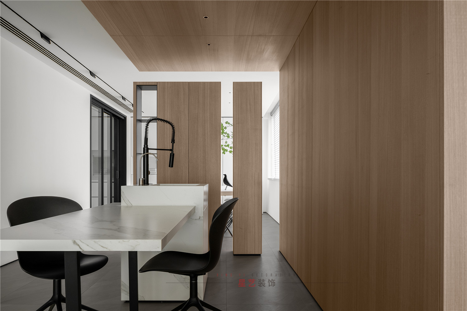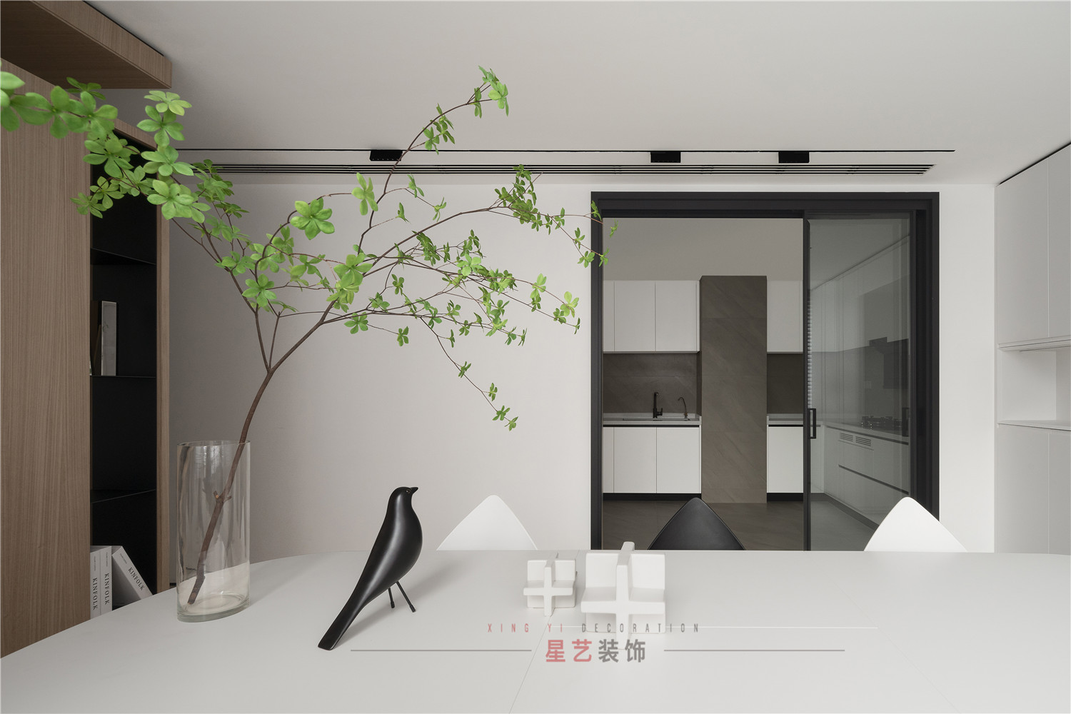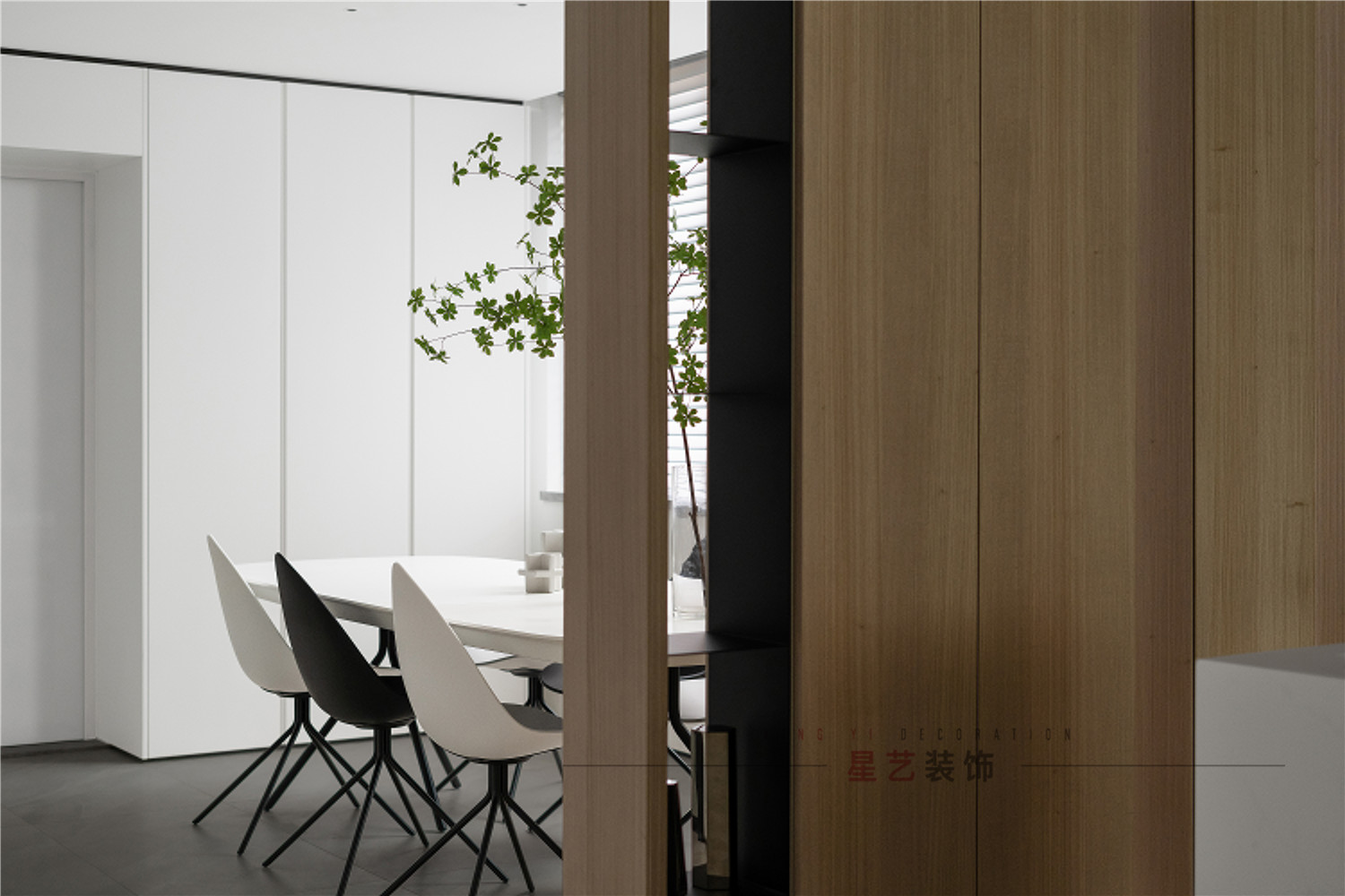 餐廳部分清新明亮,大面積的百葉窗與白色儲物柜在視覺上延伸用餐區(qū)的空間,黑白相間的桌椅虛實結(jié)合,讓整個空間有了沉穩(wěn)的底色,像是化雪后清晨,迸發(fā)勃勃生機。