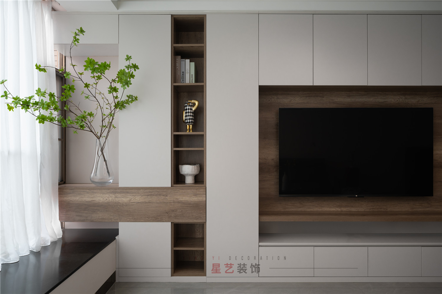 走進大門,迎面的光線穿過屏風給人一絲絲的柔和和神秘,客廳背景設計兼顧儲物和整體的空間提升,開放格的選擇尤為重要。