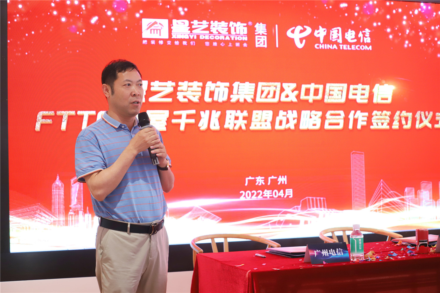 簽約儀式現(xiàn)場(chǎng),星藝裝飾廣州分公司總經(jīng)理柯志強(qiáng)、星藝裝飾廣州分公司副總經(jīng)理劉亦萍,中國(guó)電信廣州分公司關(guān)堅(jiān)成分別進(jìn)行了致辭發(fā)言。