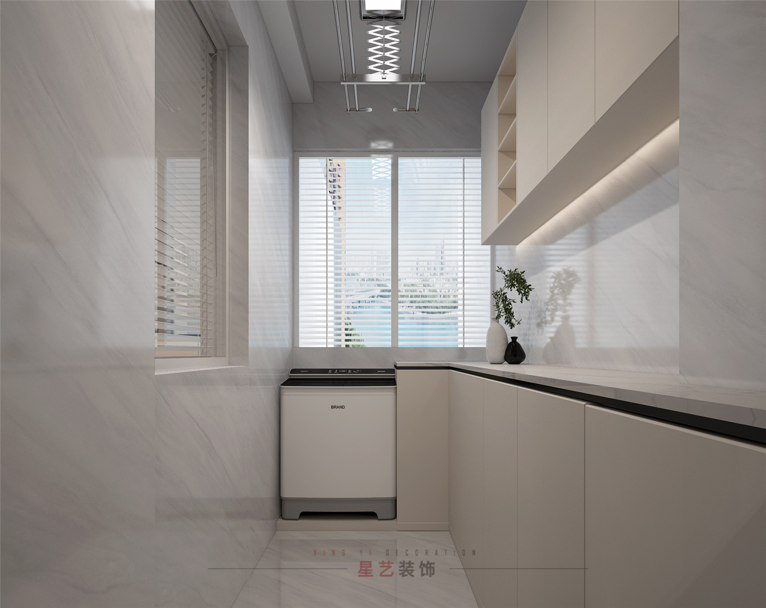 晾衣間則是明亮通透,擁有足夠的儲物柜