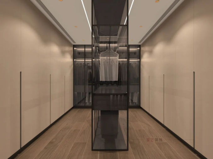 雙邊布局的衣帽間收容量更大,視覺(jué)上也顯得井井有條;配一門到頂和玻璃掩門的設(shè)計(jì),更添奢華氣質(zhì)。