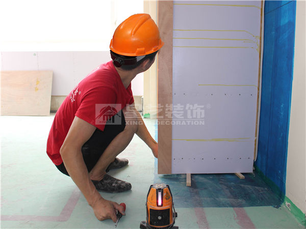 衣柜固定應(yīng)用紅外線水平儀調(diào)平,再用木楔釘入確保穩(wěn)固。