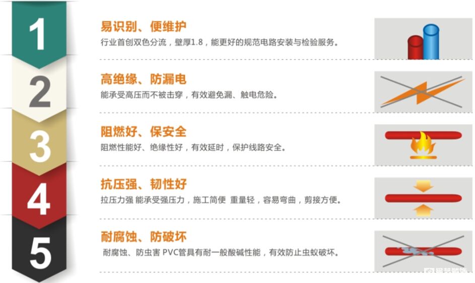 行業首創雙色電工套管,根據星藝裝飾標準工藝的要求為了更好的規范電路工程,確保工程品質,及監理與業主對電工項目的檢查與驗收,采用優質的阻燃型有色PVC塑料管作強、弱電線保護管材。紅色——強電及照明用電專用,藍色——弱電項目專用。